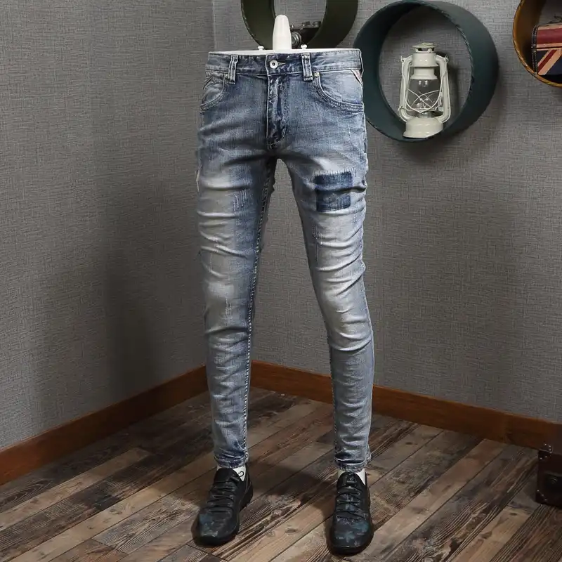 イタリアスタイルのファッション男性のジーンズ高品質レトロブルー破れジーンズ男性ヴィンテージデザイナーヒップホップジーンズオム Aliexpress