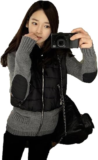 Amazon レディースアウター ジャンパー ダウンジャケット ニットスリーブ ニットステッチ ダウンベスト 上着 ツーピース風 ジッパー フード付き ジャケット コート カジュアル 防寒着 アウター 秋冬 K9706 レディース 通販