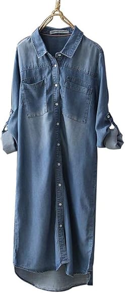 Amazon リングルー レディース シャツ デニム シャツ 超ロング丈 ワンピース シャツワンピ ロング丈 長袖 半袖 デニム トップス シンプル ゆったり スリット 薄手 ブラウス 春 夏 ジャケット 通勤 日常 ブルー M ワンピース チュニック 通販
