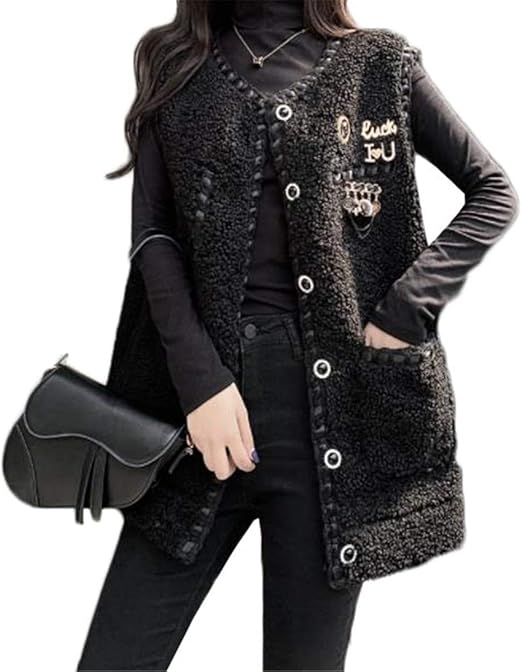 Amazon ンーセンー ムートンベスト レディース 毛皮一体 ベストコート ベスト チョッキ モコモコ 裏ボア ノースリーブ アウター マキシ丈 無地 ボタン付き ブラック F ベスト 通販