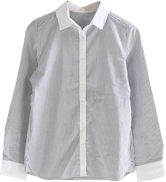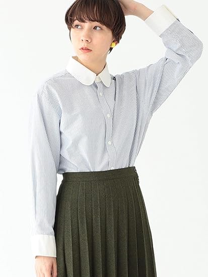 Amazon ロンショップ R O N Shop レディース ストライプ 柄 クレリック シャツ ブラウス 清楚 上品 スタンドカラー ボーダー 長袖 グレー ブルー ネイビー シャツ ブラウス 通販