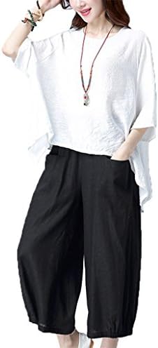 桃の花 与え 夏のスーツ女性のファッションツーピース2018新しいリネンツーピースの綿とリネンドレスのtシャツ女性のワイドレッグパンツ M 白と黒