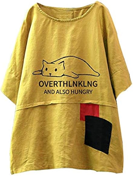 Amazon カットソー レディース Florrita レディース ファッション 漫画 刺繍猫柄 ストライプ柄 ポケットトップス 女性 上着 ゆったり ロングtシャツ チュニック 半袖 ブラウス 丸首 プルオーバー 春夏 服 セール プルオーバー 通勤 通学 部屋着 お出かけ 学生 大人 20代