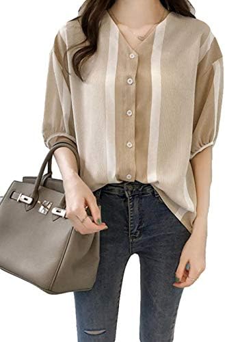 Amazon スキッパーシャツ レディース 半袖 バックボタン 体型カバー ドルマンスリーブ ストライプ 体型カバー Vネック 大きいサイズ トップス 春 夏 秋 冬 通勤 普段着 シャツ ブラウス 通販