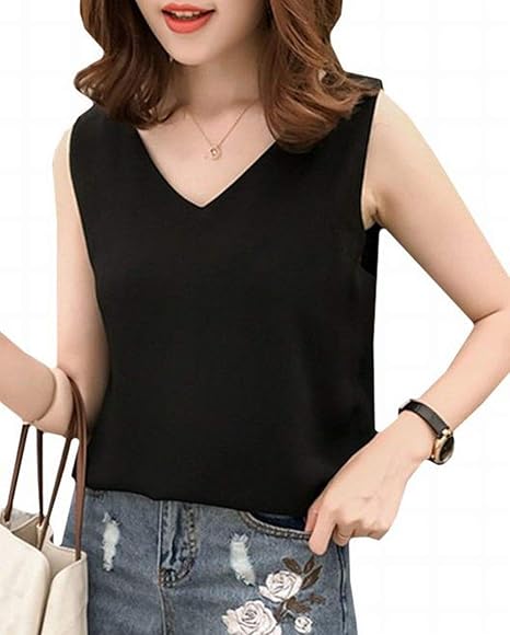 Amazon Magno レディース Vネック ノースリーブ トップス Tシャツ カットソー カジュアル シンプル 10 ブラック Sサイズ キャミソール タンクトップ 通販