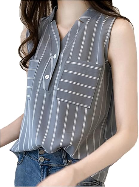 Amazon エンジェルムーン ノースリーブ レディーストップス シャツ ブラウス きれいめ カジュアル ストライプ Vネック シャツ ブラウス 通販
