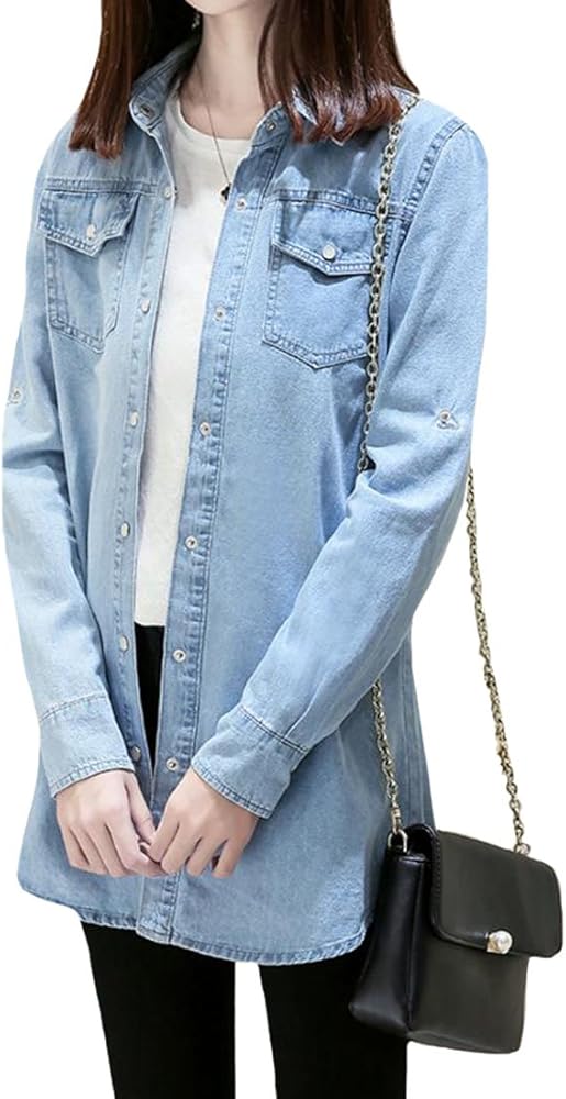Amazon Qianqian レディース デニムシャツ ロング丈 春秋 シンプル ゆったり 着痩せ カジュアル 学生シャツ ワイシャツ 綿 デニム ダンガリー トップス アウター 大きいサイズ シャツ ブラウス 通販