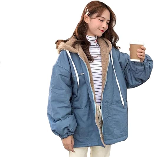 Amazon えみり コート レディース 裏ボア 防寒 ゆったり フード付き 可愛い 暖かい ファッション アウター 裏起毛 ショート丈 カジュアル Bf風 ブルー コート ジャケット 通販